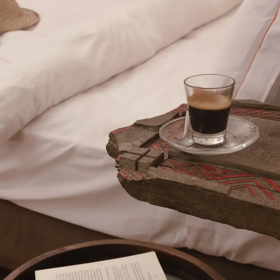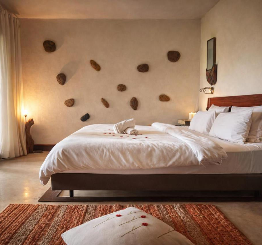 Un hommage vibrant à la terre et à la matière brute.Dans cette chambre, les galets, bruts ou peints, s’invitent partout : au sol, sur les murs, jusque dans les détails du mobilier, dessinant une atmosphère épurée, apaisante, presque méditative.