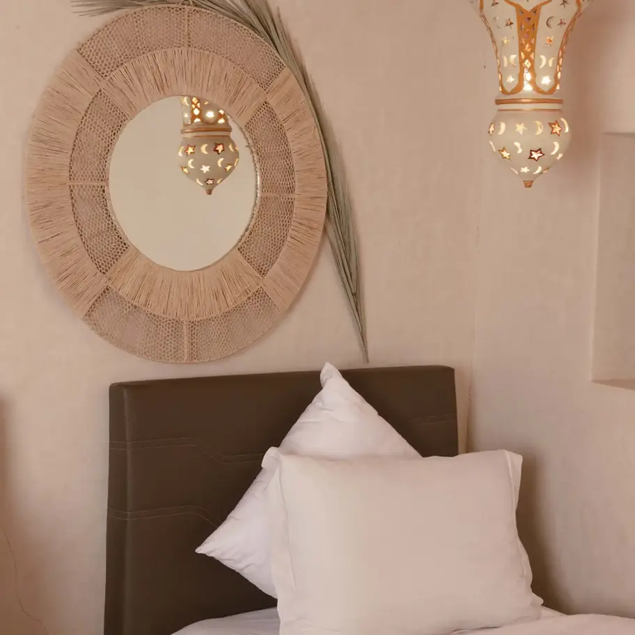 Derrière ses portes anciennes de riad sculptées à la main, deux suites au charme rustique-chic s’ouvrent sur de vastes terrasses baignées de soleil.Tadelakt naturel, fibres tressées, étoffes berbères et artisanat local donnent à chaque pièce une âme unique, entre confort simple et élégance discrète.
